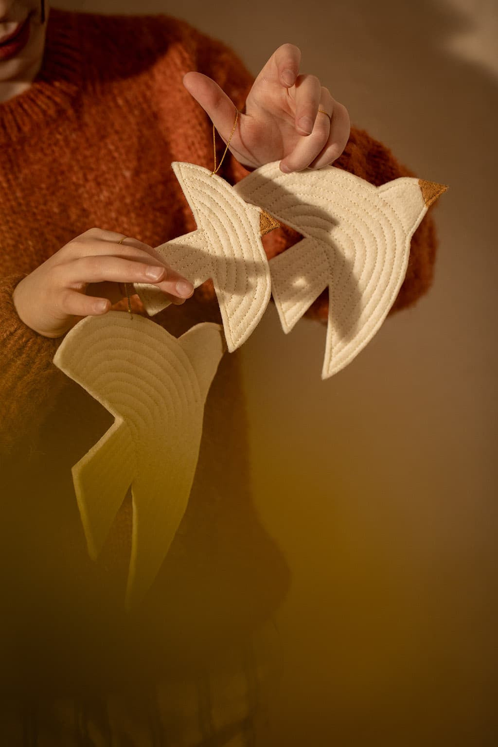 You loved our Birdy hanging decor, and now the beloved birds take flight in a charming new form — the Birdy Trio! Freed from their support, these three little birds bring playful aerial poetry into your home. Handmade in Nepal from soft, high-quality wool felt, each bird is delicately quilted by hand and finished with a tiny golden buckle for easy hanging. Available in three different colours of gentle, soothing tones, they make a whimsical accent for any room — from children’s bedrooms to living areas.