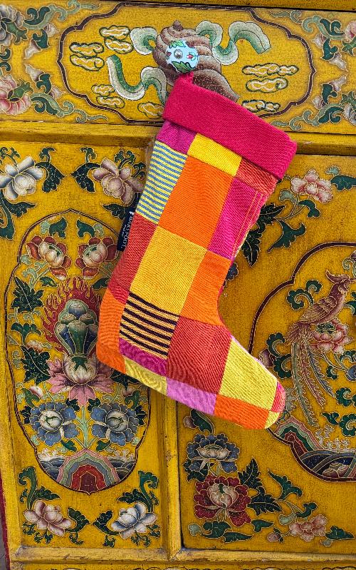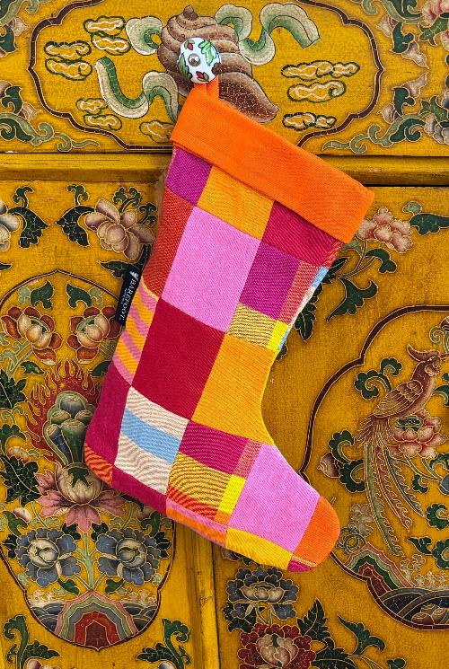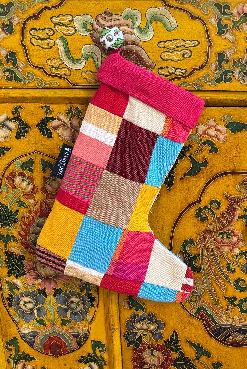 The Patchwork Stocking, handcrafted with vibrant hand-loomed fabrics, is a cheerful, one-of-a-kind piece that brings joy, warmth, and colour to your holiday celebrations.