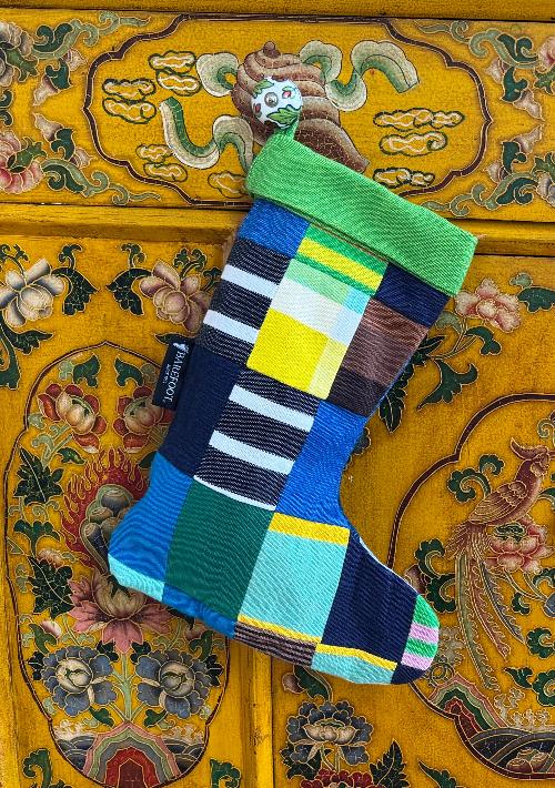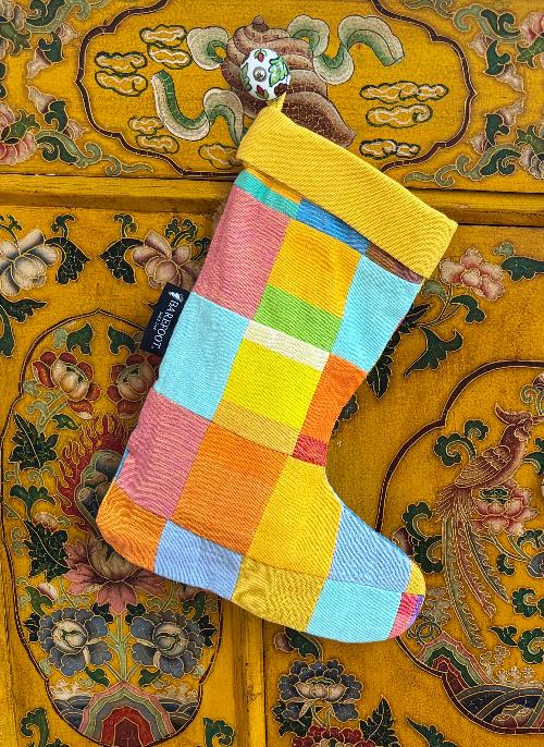 The Patchwork Stocking, handcrafted with vibrant hand-loomed fabrics, is a cheerful, one-of-a-kind piece that brings joy, warmth, and colour to your holiday celebrations.