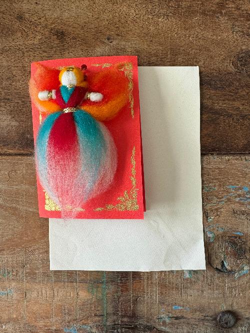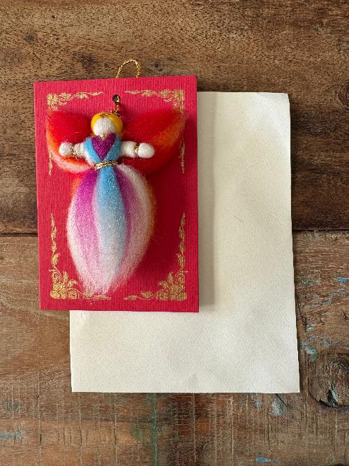 This beautiful 'Tashi Delek’ greeting card is a heartfelt way to send blessings and happiness. Made from high-quality, recycled blue paper, the card features a handcrafted angel made from 100% sheep’s wool, lovingly detachable and available in a variety of vibrant colours. Inside, the phrase “Tashi Delek” — an auspicious Tibetan greeting — warmly expresses good wishes, perfect for Christmas, birthdays, or any occasion where peace and joy are the message.